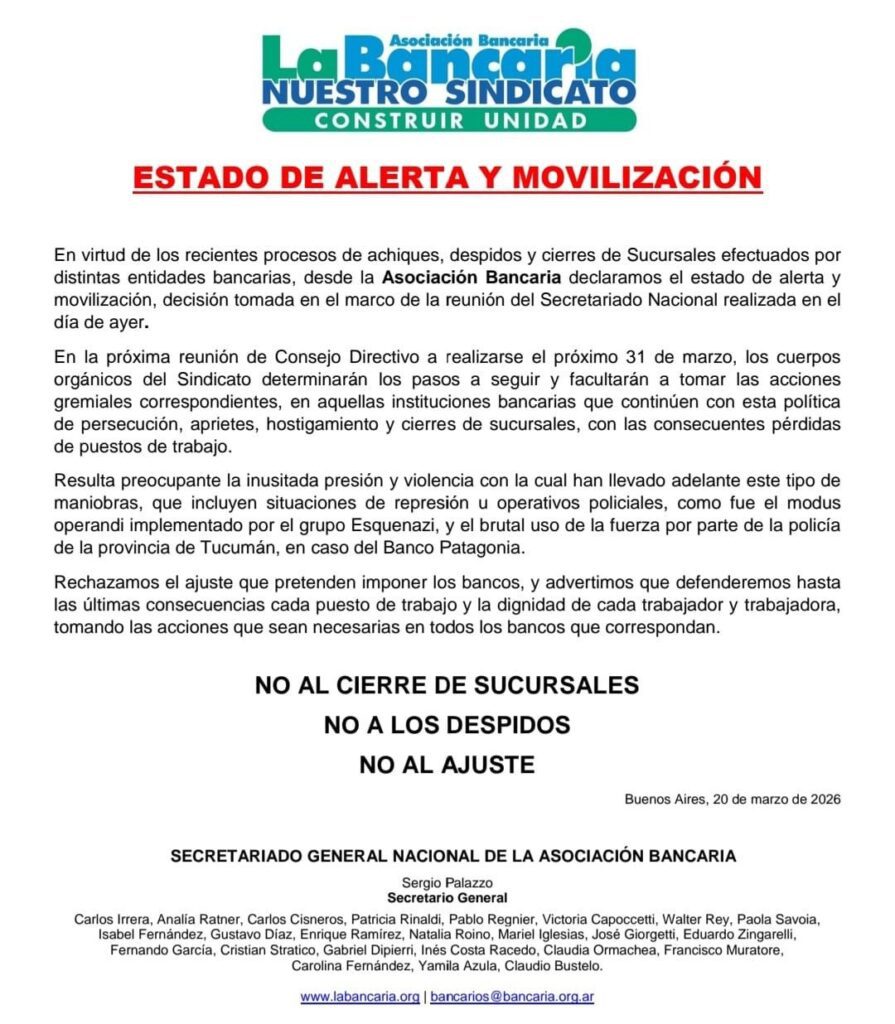 El Banco Central cierra sucursales en el interior y peligra la regional Bahía Blanca 20 de marzo de 2026